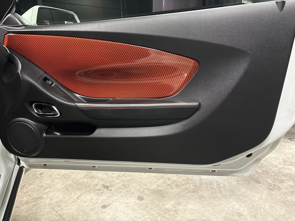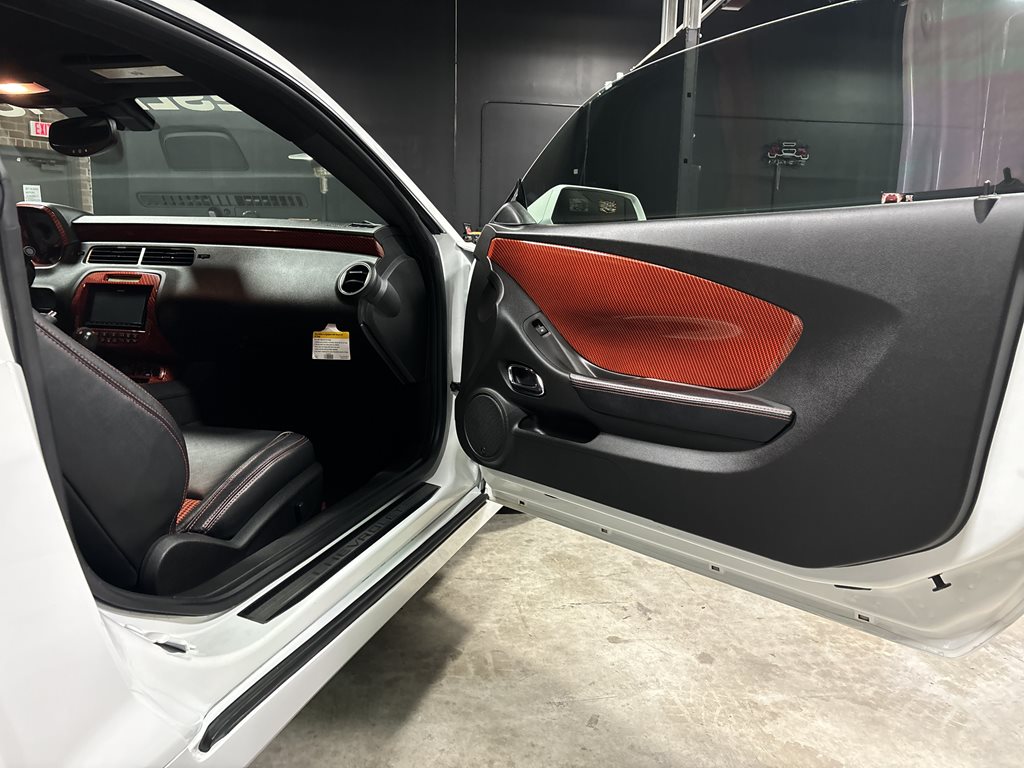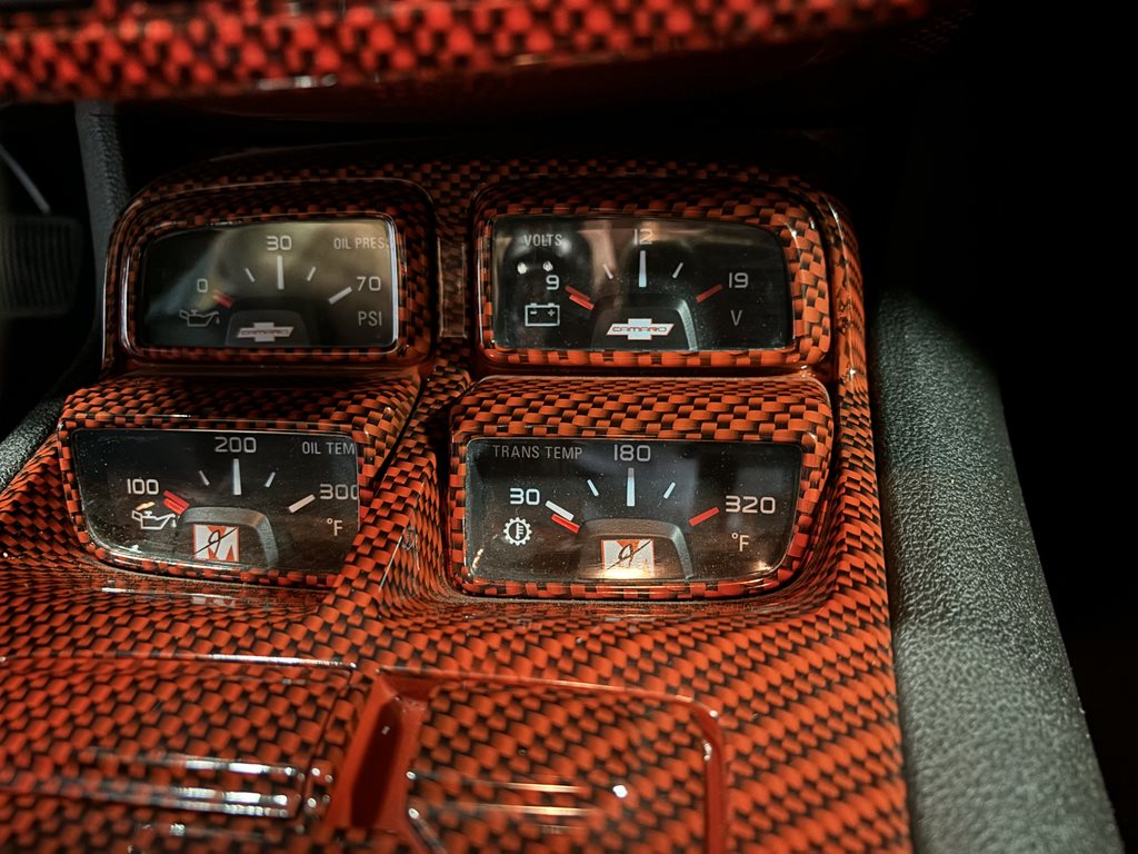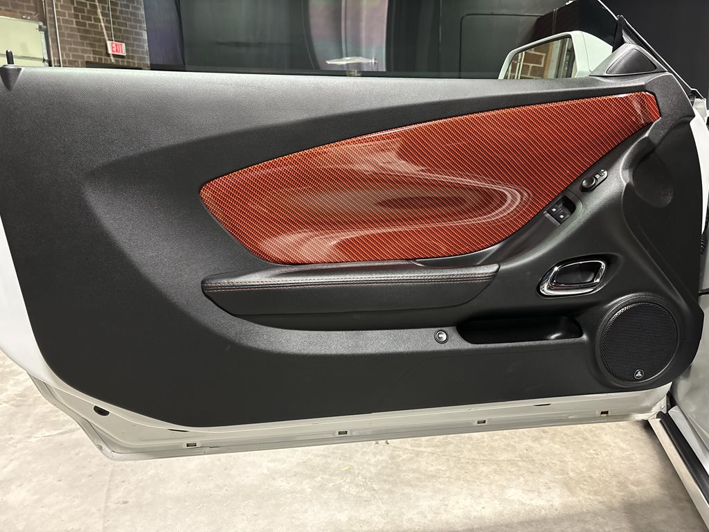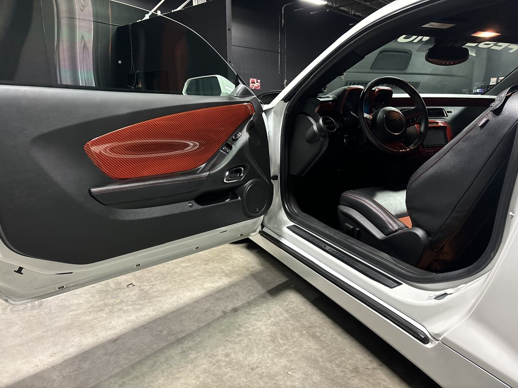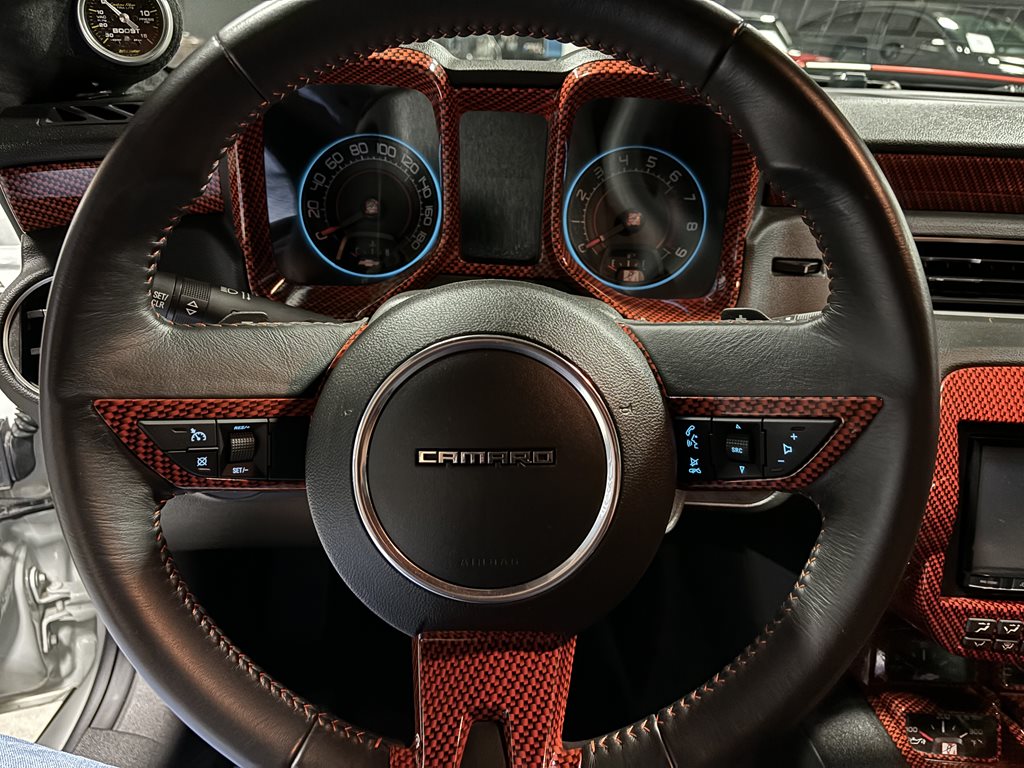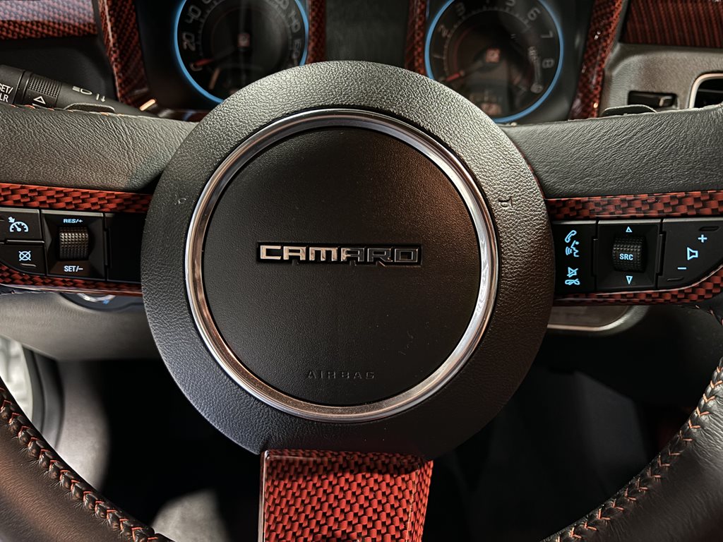 Inside, the cabin is a retro-modern statement piece. Houndstooth seat inserts meet extensive Hydro-Carbon trim for a period-correct look executed with contemporary materials. Infotainment comes from a modern touchscreen navigation head unit feeding a 1,350-watt audio system with three subwoofers, while bespoke Fesler-Moss-stitched leather and Cadillac touch-sensing door handles elevate everyday touchpoints. The overall effect is cohesive: classic Camaro character with 21st-century comfort and tech.