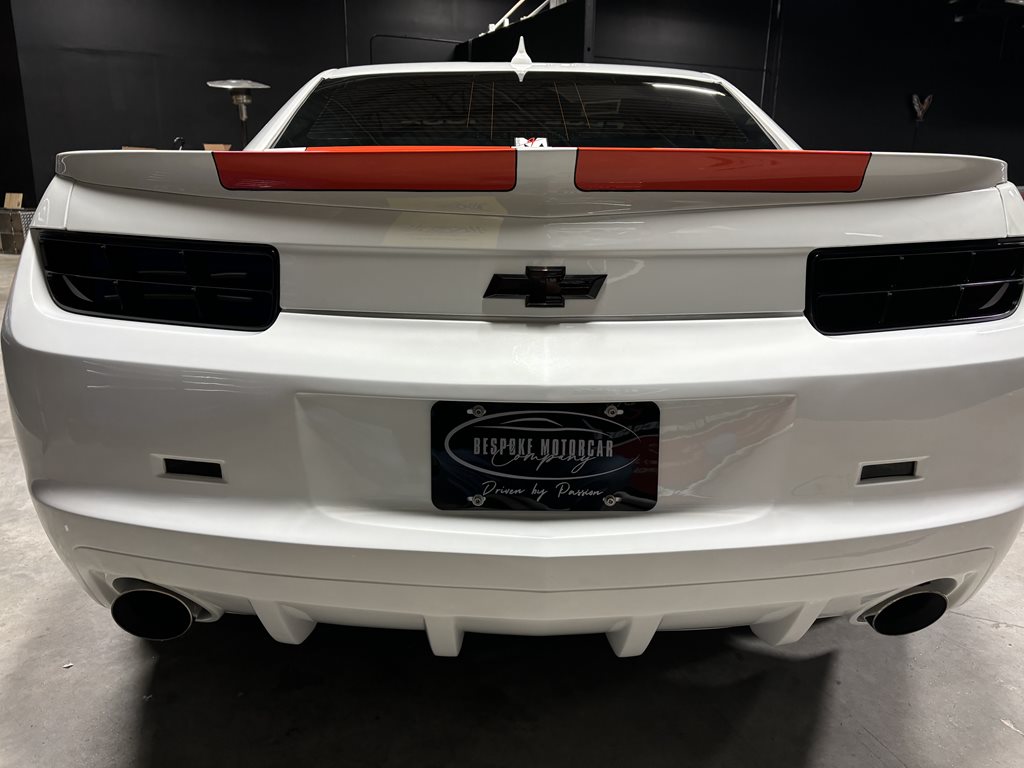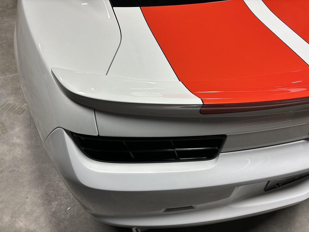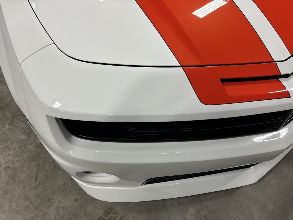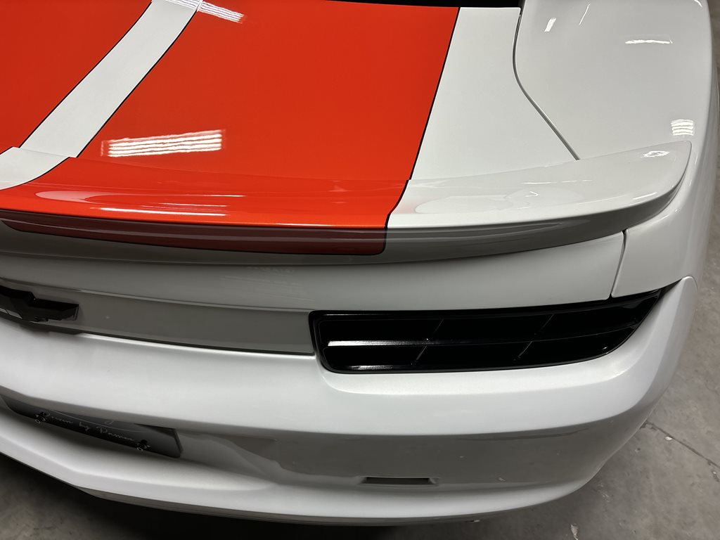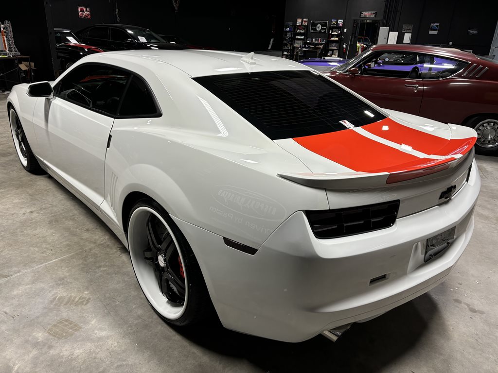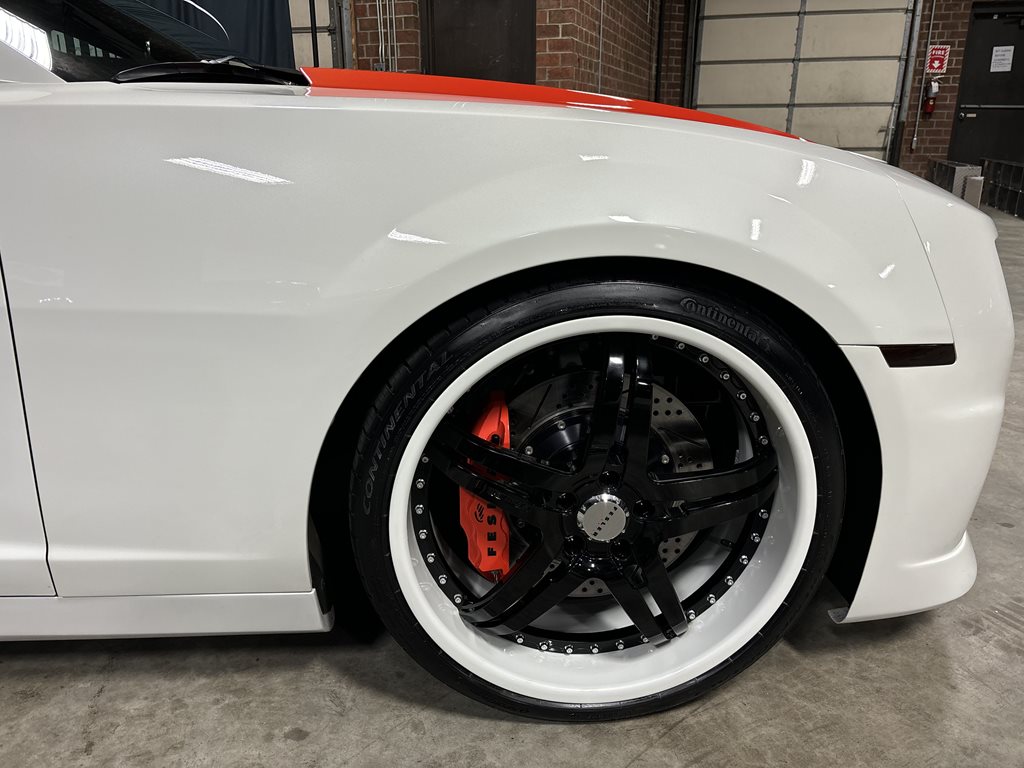 Exterior styling is a bespoke Fesler Built design that nods to 1969 while remaining distinctly modern. A lower, wider front fascia with billet aluminum grilles and fog-lamp bezels leads to sculpted rocker moldings and a cleanly finished rear with a restyled spoiler and custom taillamps. The paint is 1969 Chevy white mixed with metallic and pearl and accented by bold orange stripes, laid down by Gary Sharp of Prescott Auto Body. The result is show-quality finish work that reads as factory-quality, just more purposeful.