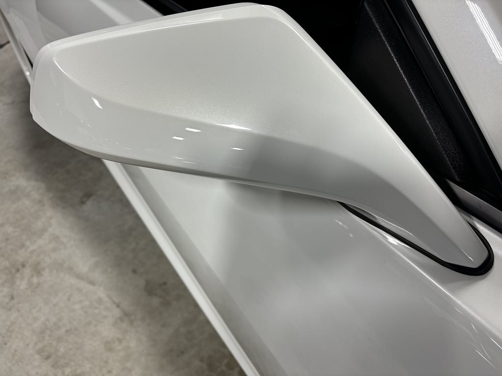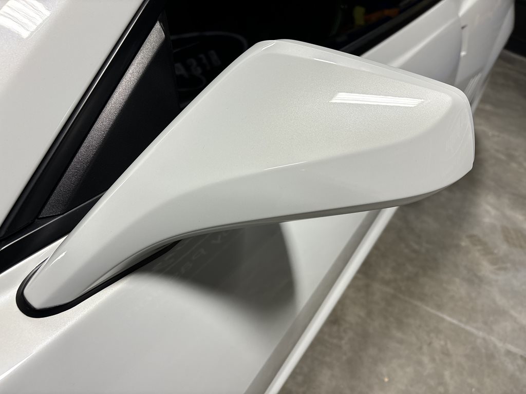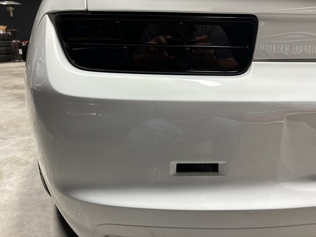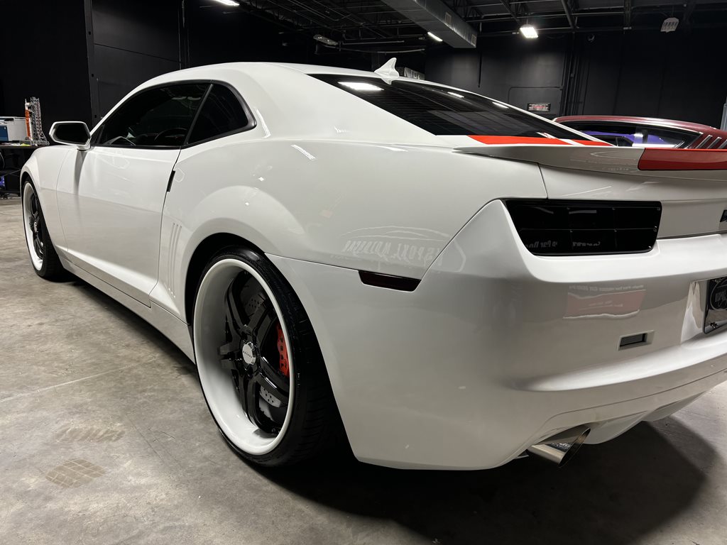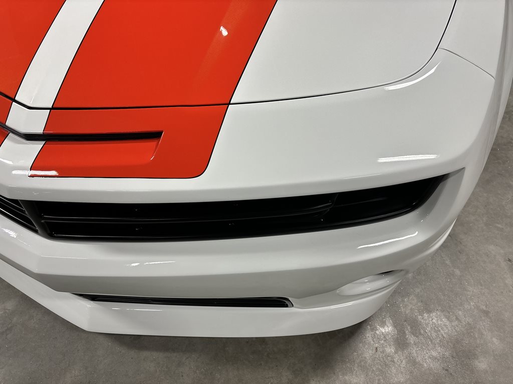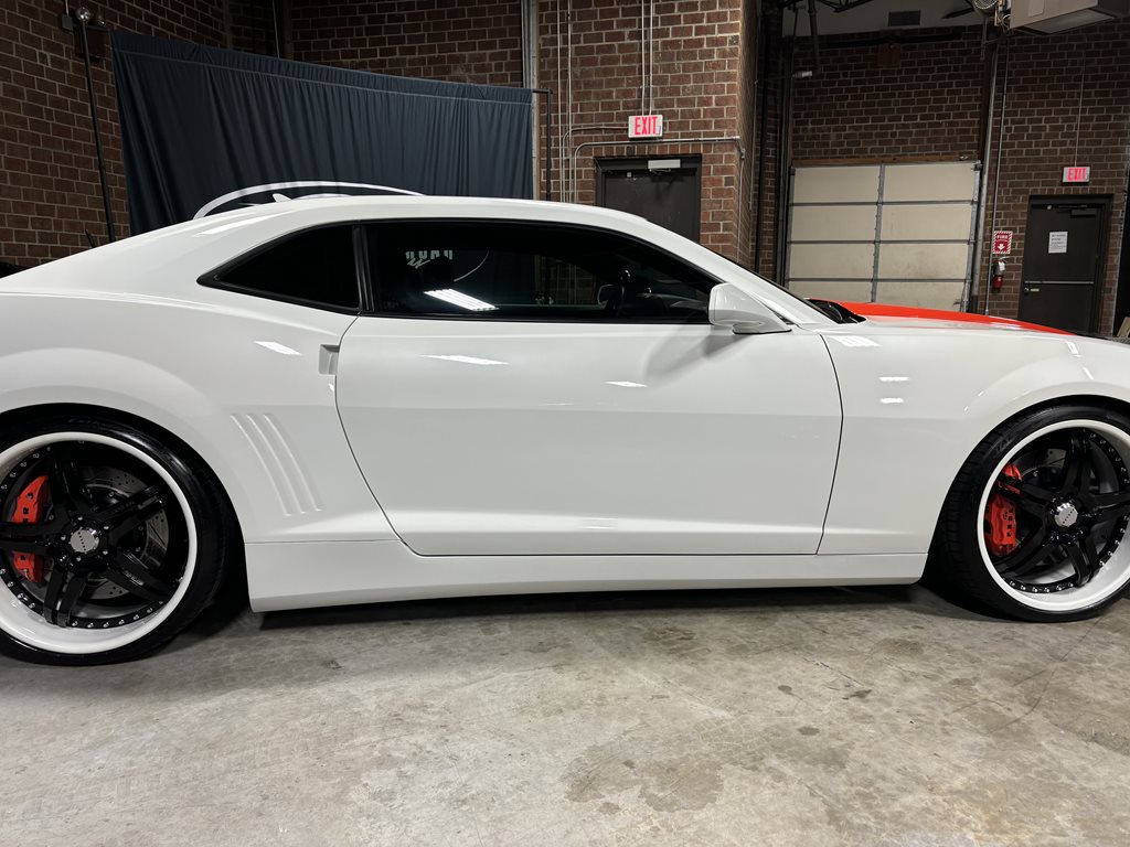 Exterior styling is a bespoke Fesler Built design that nods to 1969 while remaining distinctly modern. A lower, wider front fascia with billet aluminum grilles and fog-lamp bezels leads to sculpted rocker moldings and a cleanly finished rear with a restyled spoiler and custom taillamps. The paint is 1969 Chevy white mixed with metallic and pearl and accented by bold orange stripes, laid down by Gary Sharp of Prescott Auto Body. The result is show-quality finish work that reads as factory-quality, just more purposeful.