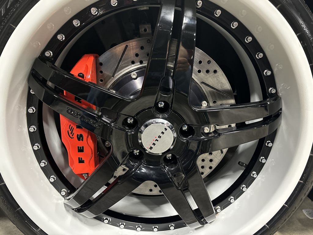 Chassis tuning centers on the Pedders Track II package, which brings 30-way-adjustable coilovers, comprehensive bushings, and 27-mm anti-roll bars with upgraded end links. The ride height is lowered about two inches, which sharpens turn-in, quells wheel hop, and drops the center of gravity. Braking is handled by a Fesler-branded Baer setup at all four corners, pairing 15-inch rotors with six-piston calipers, braided lines, and a Baer proportioning valve—serious hardware sized to match LS9 thrust.