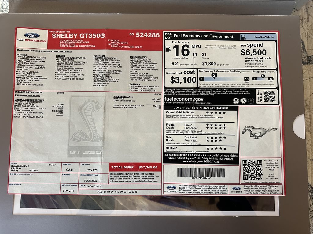 Under the hood, the GT350 is powered by a 5.2-liter V8 engine that roars to life with an impressive 526 horsepower and 429 lb-ft of torque, providing exhilarating acceleration and a spine-tingling exhaust note. Coupled with the precision-engineered Tremec 6-speed manual transmission, this car offers an engaging driving experience that makes every shift feel like a moment to remember. Whether you're carving through corners or cruising on the open highway, the GT350 delivers a pure, unfiltered connection to the road.