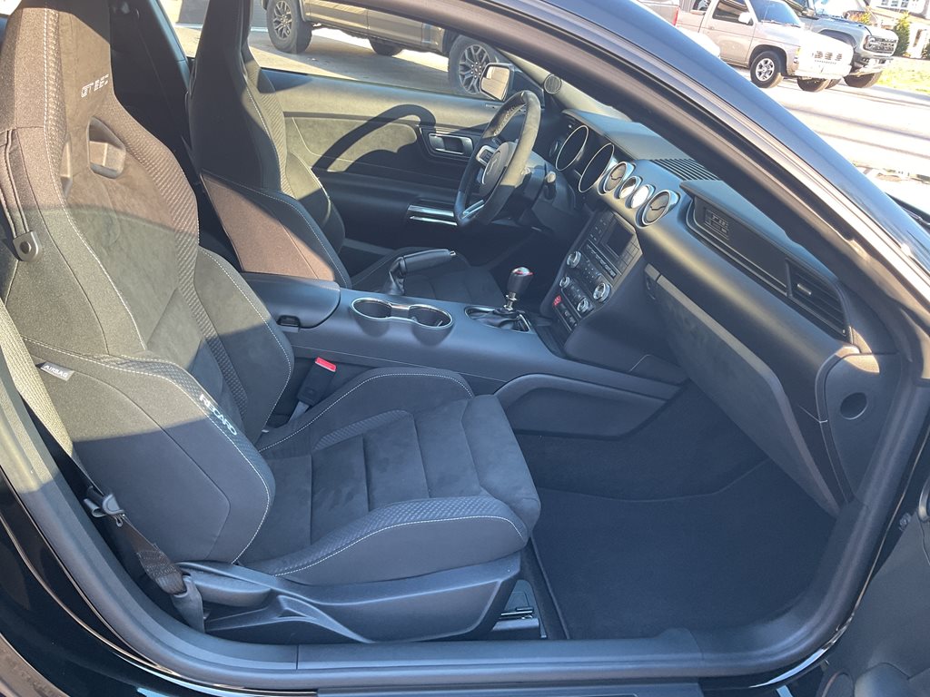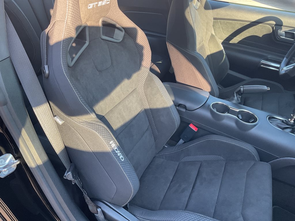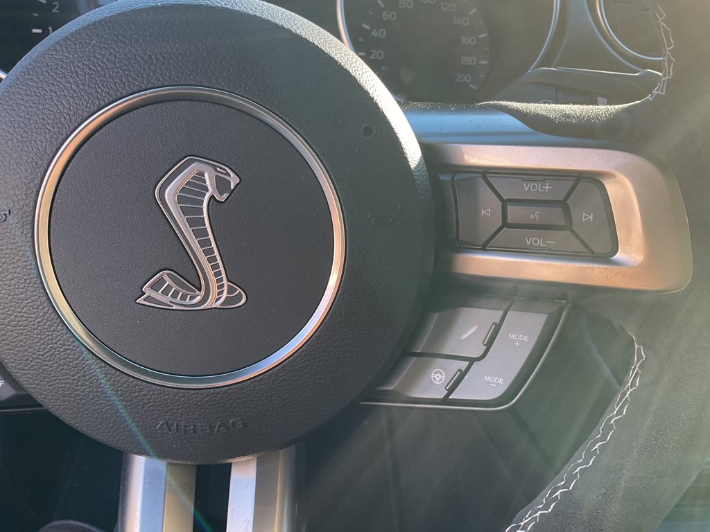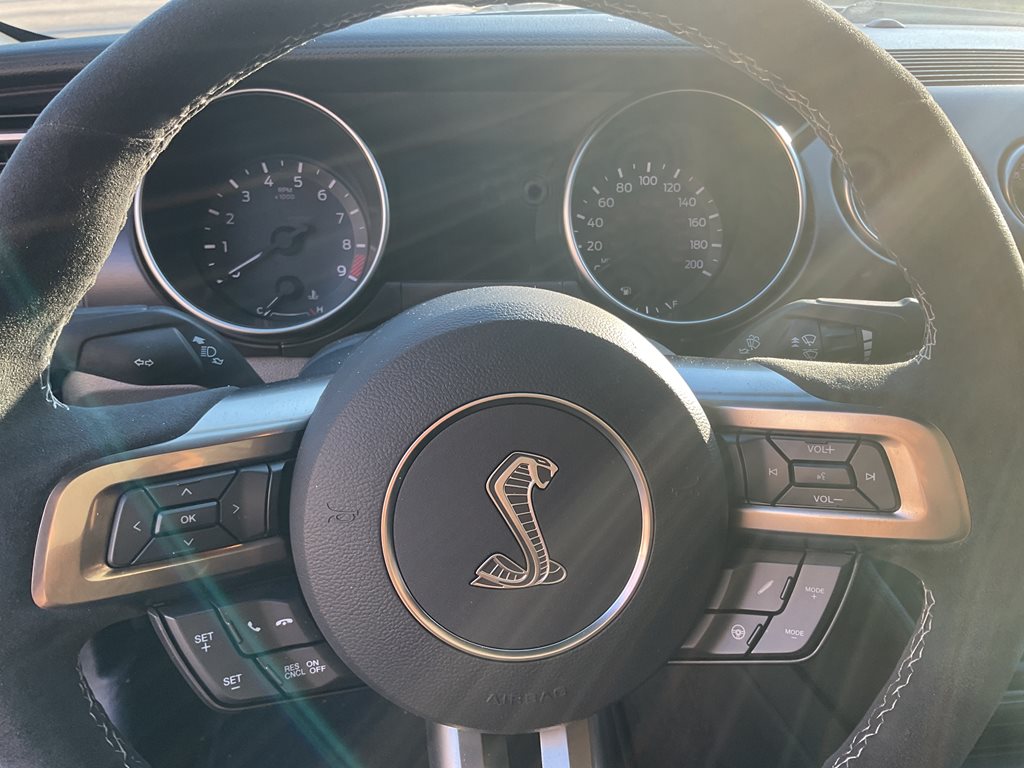 Inside, the cabin blends performance styling with premium comfort through leather and Miko suede sport seats, aluminum interior accents, and a driver focused cockpit. A premium sound system and performance data display further enhance the driving experience, while the unique Shelby gauges and flat bottom steering wheel reinforce the car’s motorsport inspired design.